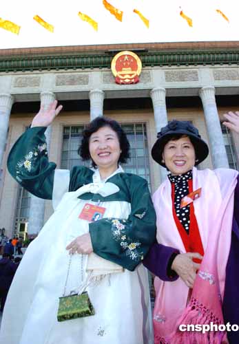 三月十二日下午,全國(guó)政協(xié)十屆三次會(huì)議在北京人民大會(huì)堂閉幕,全國(guó)政協(xié)委員樸惠善(左)、李承淑(右)愉快地走出會(huì)場(chǎng)。作者:陳文