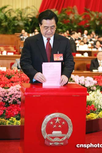 在今天上午舉行的十屆全國人大三次會(huì)議第四次全會(huì)上,中共中央總書記、國家主席、中共中央軍委主席胡錦濤高票當(dāng)選為國家軍委主席,眾望所歸成為中國黨和國家的最高軍事統(tǒng)帥。