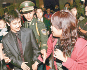 中新網(wǎng)3月17日電 據(jù)香港《大公報(bào)》報(bào)道,二○○五年度中國(guó)十佳勞倫斯冠軍頒獎(jiǎng)典禮昨晚在深圳舉行,出席運(yùn)動(dòng)員有劉翔、田亮等,頒獎(jiǎng)嘉賓則有劉嘉玲、成龍、郭富城等,運(yùn)動(dòng)員與明星互相輝映,星光熠熠,在場(chǎng)夾道歡迎的Fans為之瘋狂。當(dāng)中又以田亮表現(xiàn)最為親切,他主動(dòng)走向前同F(xiàn)ans“giveme five”,令Fans們樂(lè)開懷?磥(lái)田亮未有受與吳敏霞緋聞?dòng)绊憽?object align="left" classid="clsid:D27CDB6E-AE6D-11cf-96B8-444553540000" codebase="http:///pub/shockwave/cabs/flash/swflash.cab#version=5,0,0,0" height="250" width="350">