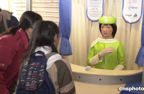 日本愛知世博會從三月十八日至二十日舉行正式開幕前的預(yù)覽會,從事各種工作的各色機(jī)器人也紛紛上崗。圖為世博會入口附近的仿真式向?qū)C(jī)器人,正在向入場者作講解。據(jù)介紹,這款機(jī)器人可用中、日、英、韓四種語言同參觀者簡單會話,并介紹和指點(diǎn)展示內(nèi)容等。作者:王健