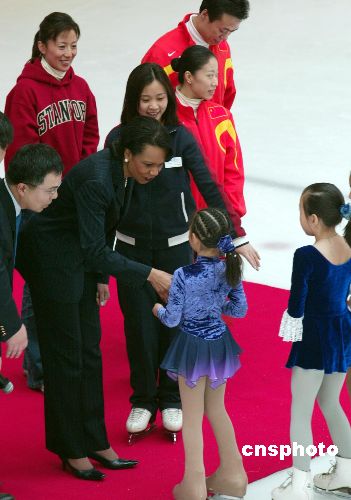 美國國務(wù)卿賴斯三月二十一日在北京與中國花樣滑冰愛好者親切交流,中國著名雙人滑選手申雪、趙宏博、冬季奧運會金牌選手楊陽等陪同出席活動。作者:滿會喬