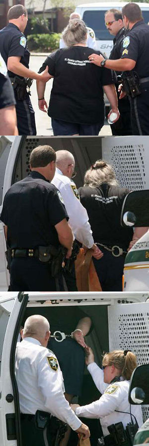 圖為當?shù)厥ジダ饰魉故刑熘鹘坦ぷ魅藛T賈科布被佛羅里達州警方以“非法侵入他人領(lǐng)地”罪逮捕。賈科布試圖偷偷將一瓶水帶給植物人夏沃。(固山)