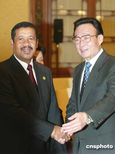 全國(guó)人大常委會(huì)委員長(zhǎng)吳邦國(guó)三月二十三日在北京會(huì)見來(lái)訪的馬達(dá)加斯加國(guó)民議會(huì)議長(zhǎng)拉依尼里庫(kù)一行。作者:滿會(huì)喬