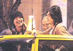 翻版金城武一邊露出大半條底褲與女伴上車(chē),一邊用手摸言承旭的面道別,兩個(gè)大男人當(dāng)街摸面,言承旭不但不抗拒,更露出燦爛笑容,之后他便乘坐友人的私家車(chē)離去。