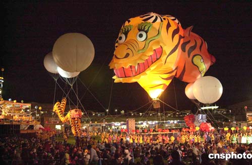 日本愛知世博會三月二十五日開展。當(dāng)晚,在世博廣場舉行慶祝表演“生命的節(jié)日”,一個巨大的虎形熱氣球款款升空,場面頗為壯觀。作者:王健