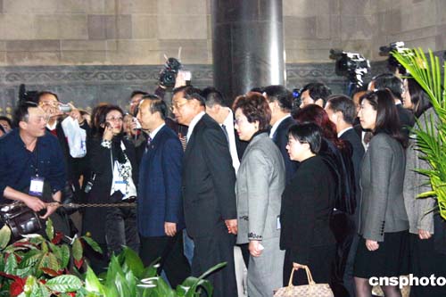 三月三十日上午九點(diǎn),國民黨參訪團(tuán)拜謁中山陵的祭拜儀式正式開始。江丙坤代表中國國民黨主席連戰(zhàn)及全體國民黨黨員向中山陵敬獻(xiàn)花籃。參訪團(tuán)所有成員均向?qū)O中山遺像三鞠躬并默哀一分種。圖為參訪團(tuán)所有成員在孫中山陵寢旁繞場(chǎng)一周,瞻仰孫中山遺像。作者:陳旻