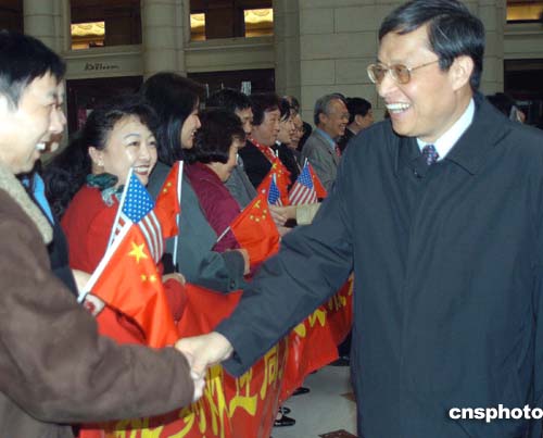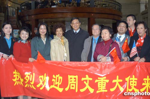 中國新任駐美大使周文重當(dāng)?shù)貢r(shí)間四月三日中午抵達(dá)美國首都華盛頓履新,受到當(dāng)?shù)厝A人僑學(xué)界代表的熱烈歡迎。
