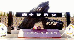 據(jù)介紹,該礦難警示碑位于“一一·二八”遇難礦工公墓正前方,由兩塊堅實的煤炭雕塑構成了一個巨大的“人”字坐落在花崗巖的碑座上。碑座的正中是一個黃銅色的礦工帽。碑座前面鐫刻八個醒目大字“安全為天警鐘長鳴”,背面銘刻著在此次礦難中遇難的一百六十六名礦工的名字。碑的后面,是一排排翠柏環(huán)繞的遇難礦工墓碑。