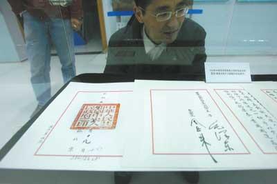 在100平方米左右的展廳里,存放在玻璃展柜中的一份顏色微紅、長約一米的文件特別顯眼,文件的右側有兩個紅色的繁體大字“國書”。這是1950年由我國首任駐瑞典大使耿飆呈遞給瑞典國王的國書復制件,完全按照當年新中國第一批國書的標準復制,大小及式樣與原件一模一樣。它是特別從瑞典外交部那里復制得來的,因為國書是交給外國的,本國自己不保存。