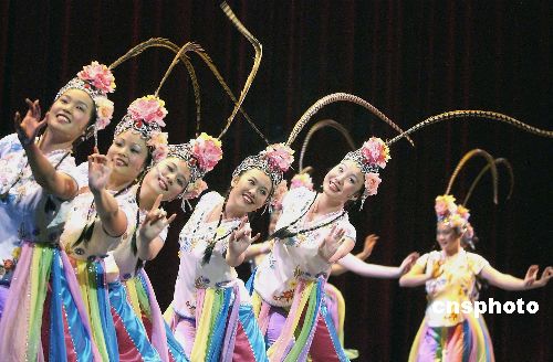 二00五年美國中華演藝學(xué)院華裔學(xué)生匯報(bào)公演四月十七日在加州圣塔克拉拉大學(xué)舉行。圖為華裔學(xué)生們表演中國古典舞《俏花旦》。作者:陳鋼