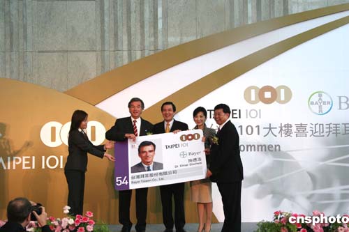 臺(tái)北101大樓十八日入駐第一家租戶——臺(tái)灣拜爾公司,象征著這座世界最高的摩天大樓開始從單純觀光旅游向高檔辦公大樓功能跨越。圖為臺(tái)北101大樓董事長(zhǎng)陳敏熏(右二)象征性頒給“房客”拜耳大中華區(qū)董事長(zhǎng)施德浩(左二)智能芯片卡識(shí)別證及租戶手冊(cè)。臺(tái)北市長(zhǎng)馬英九(中)前往見證入厝儀式。作者:楊伏山