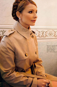 從雜志社提前披露的一些插圖來看,拍攝地點應是季莫申科總理在政府大樓內(nèi)的休息室,家具比較大氣,也顯得有些笨重,具有典型的蘇聯(lián)官員風格,顯然,已有不止一屆的政府總理使用過。季莫申科不僅穿著西裝,還戴有披風。