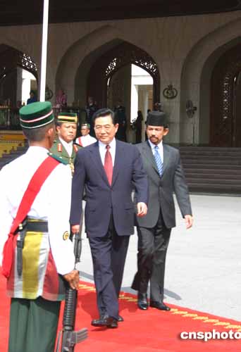胡錦濤是應文萊達魯薩蘭國蘇丹哈桑納爾的邀請,對文萊進行國事訪問的。文萊王儲夫婦到機場迎接。