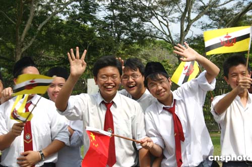 4月20日,文萊中學(xué)生王宮外列隊(duì)歡迎中國(guó)國(guó)家主席胡錦濤到訪。作者:李靜