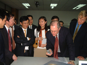 長(zhǎng)虹公司董事長(zhǎng)趙勇及其他領(lǐng)導(dǎo)陪同客人們參觀了長(zhǎng)虹國(guó)家級(jí)技術(shù)中心有關(guān)實(shí)驗(yàn)室,來(lái)賓們對(duì)長(zhǎng)虹新近研發(fā)的產(chǎn)品產(chǎn)生濃厚的興趣,一次又一次地停下來(lái)觀看、詢(xún)問(wèn)和試操作。