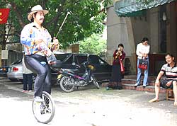 今年四十九歲的呂布是廣西南寧市一位民間藝術(shù)家,他可在獨輪車上自如演奏中國和西方的樂器達一個小時之久。呂布愛好二胡,二00一年他開始迷上雜技獨輪車,苦練三年多后,他如今已能邊騎獨輪車邊演奏薩克斯、二胡、笛子、葫蘆絲等四種樂器。作者:蔣雪林