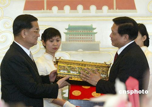 會(huì)見(jiàn)結(jié)束后,賓主互贈(zèng)禮物表深意。劉淇向連戰(zhàn)贈(zèng)送了微縮的金絲鑲嵌景泰藍(lán)九龍壁,連戰(zhàn)向劉淇回贈(zèng)祖父連橫的著作《臺(tái)灣通史》,自己的近作《改變,才有希望》,以及一個(gè)名為“希望振飛”的琉璃工藝品。