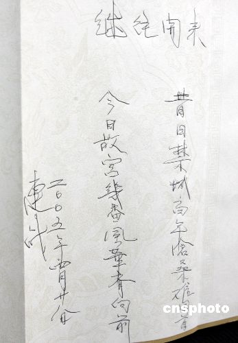 中新網(wǎng)4月28日電(記者 任晨鳴)中國國民黨主席連戰(zhàn)一行4月28日下午到北京故宮參觀,在乾清門前揮筆寫下與夫人方瑀共同撰寫的對聯(lián)。上聯(lián):昔日禁城百年滄桑難回首。下聯(lián):今日故宮幾番風(fēng)華齊向前。橫批:繼往開來。