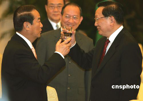 五月十一日晚,中共中央政治局常委曾慶紅在北京人民大會(huì)堂宴請(qǐng)親民黨主席宋楚瑜一行,宋楚瑜致詞后向出席宴會(huì)的國(guó)務(wù)委員唐家璇敬酒。作者:任晨鳴