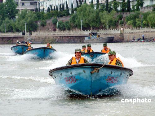 隨著錢塘江支流--蘭江進入了主汛期,5月17日下午,浙江省蘭溪市2005年水上堤防抗洪搶險演習在蘭江馬公嘴城防大堤上舉行。100余名防汛機動搶險隊員進行了滑坡?lián)岆U和水上救護模擬險情演習,從而檢驗了防汛預警機制的有效性。作者:胡肖飛