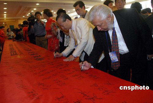 由國務(wù)院僑務(wù)辦公室和中國海外交流協(xié)會(huì)主辦的“第三屆世界華僑華人社團(tuán)聯(lián)誼大會(huì)”五月十九日在北京開幕,圖為與會(huì)代表在“增進(jìn)共識凝聚力量反對臺獨(dú)促進(jìn)統(tǒng)一”橫幅上簽名。作者:張勤