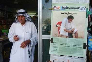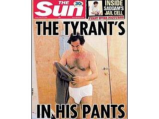 在巴格達的咖啡店,伊拉克人正在觀看一些阿拉伯衛(wèi)星電視臺播放《太陽報》頭版刊登的照片,其中一張就是薩達姆只穿內(nèi)褲站著的照片!短枅蟆愤刊登著薩達姆在洗衣服、睡覺以及在獄中踱步等鏡頭。