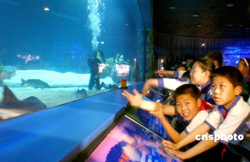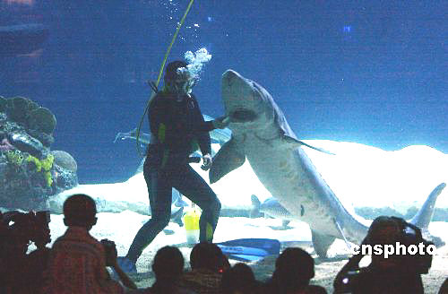 五月二十六日,觀察科研人員在水下對(duì)中華鱘投喂鯽魚(yú)。從第一尾國(guó)寶級(jí)中華鱘進(jìn)入北京海洋館至今,二十六尾中華鱘已經(jīng)完全適應(yīng)人工喂養(yǎng)。作者:韓藝冰