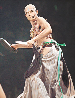中新網6月2日電 據(jù)香港媒體報道,郭富城《舞臺寶典@飛越舞林演唱會2005二部曲》前晚于紅館開鑼,城城施展渾身解數(shù),以無數(shù)個性感的突破熱爆會場,光頭造型戴乳飾露股肉加上欲望翼,都可見城城于舞臺上別具一格,造型獨特。