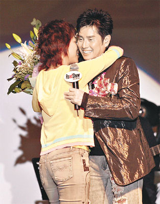 中新網6月7日電 據香港媒體報道,前晚在九展舉行音樂會,慶祝歌迷會成立二十五周年,除了香港fans外,還有來自內地、臺灣、新加坡和日本等地過千的歌迷,他們送上球衣、字畫甚至火鍋醬料作禮物,有臺灣女fans更飛身擁抱吻了阿倫一啖,十分熱情。