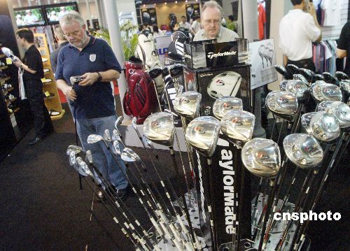 六月十一日,在北京舉行的2005第四屆中國(北京)國際高爾夫球博覽會吸引眾多中外參觀者。圖為外國客商在仔細(xì)觀賞精美的高爾夫球具。作者:錢興強(qiáng)