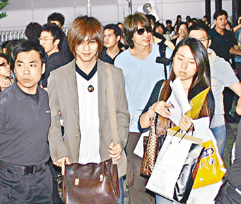 當言、周二人出閘,fans欣喜若狂,場面一發(fā)不可收拾,三十多名保安、十多名警察嚴陣防亂。現(xiàn)場所見,明顯以言承旭fans的聲勢比周渝民強勁得多,難怪言承旭不時風騷地向群眾揮手,反觀周渝民則頭耷耷,無厘神氣。最后二人在保安筑成人墻護送下登車離去。