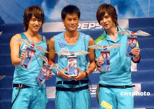 中新網(wǎng)6月17日電 據(jù)香港媒體報(bào)道,古天樂、言承旭(Jerry)及周渝民(仔仔),前晚一身藍(lán)色裝扮,出席《百事藍(lán)色風(fēng)暴615公告首部曲》記者會(huì),吸引了五百歌迷捧場(chǎng),場(chǎng)面熱鬧。由于仔仔上周四生日,古仔及Jerry特別送上蛋糕慶祝,Jerry更當(dāng)場(chǎng)飛擒咬吻仔仔。至于仔仔的生日愿望,則是身體健康、支持F4、古天樂及百事。