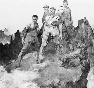 1941年8月,侵華日軍華北方面軍調(diào)集7萬余人的兵力,對(duì)晉察冀邊區(qū)所屬的北岳、平西根據(jù)地進(jìn)行毀滅性“大掃蕩”。9月25日,日偽軍約3500余人圍攻易縣城西南的狼牙山地區(qū),企圖殲滅該地區(qū)的八路軍和地方黨政機(jī)關(guān)。晉察冀軍區(qū)第1軍分區(qū)某部第7連奉命掩護(hù)黨政機(jī)關(guān)、部隊(duì)和群眾轉(zhuǎn)移。完成任務(wù)撤離時(shí),留下第6班馬寶玉等5名戰(zhàn)士擔(dān)負(fù)后衛(wèi)阻擊,掩護(hù)全連轉(zhuǎn)移。他們堅(jiān)定沉著,利用有利地形,奮勇還擊,打退日偽軍多次進(jìn)攻,斃傷90余人。次日,為了不讓日偽軍發(fā)現(xiàn)連隊(duì)轉(zhuǎn)移方向,他們邊打邊撤,將日偽軍引向狼牙山棋盤陀峰頂絕路。日偽軍誤認(rèn)咬住了八路軍主力,遂發(fā)起猛攻。5位戰(zhàn)士臨危不懼,英勇阻擊,子彈打光后,用石塊還擊,一直堅(jiān)持戰(zhàn)斗到日落。面對(duì)步步逼近的日偽軍,他們寧死不屈,毀掉槍支,義無反顧,縱身跳下數(shù)十丈深的懸崖。馬寶玉、胡德林、胡福才壯烈殉國;葛振林、宋學(xué)義被山腰樹枝掛住,幸免于難。