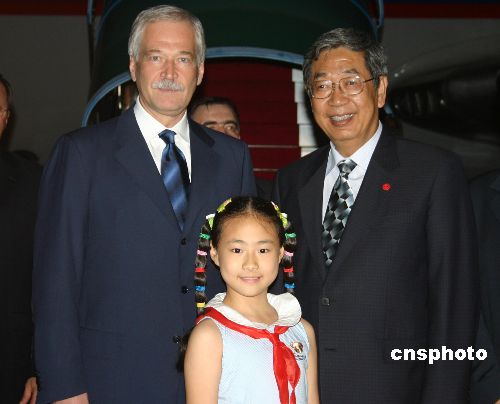 六月十七日,俄羅斯國家杜馬主席格雷茲洛夫一行二十三人抵達重慶江北國際機場,開始在渝訪問。圖為中國全國人大常委會副委員長許嘉璐(右一)在重慶機場迎接格雷茲洛夫(左一)。作者:郭晉嘉