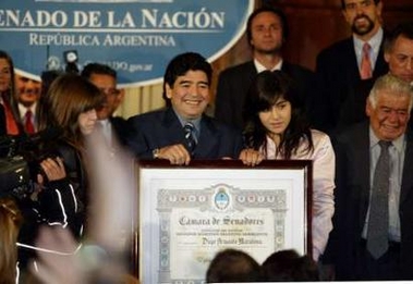 中新網(wǎng)6月22日電 走在紅地毯上,在眾多知名政客的簇?fù)硐,阿根廷球星馬拉多納從阿根廷副總統(tǒng)兼參議院議長肖利手里接受了國會榮譽(yù)勛章。