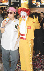 頭戴粉紅色帽子及架著墨鏡的陳奕迅,昨日精神奕奕出席麥當(dāng)勞剪彩儀式,現(xiàn)場(chǎng)除有青春少女跳舞助興外,還有醒獅點(diǎn)睛、切燒豬及祝酒儀式,Eason與麥當(dāng)勞叔叔喜相逢,二人合照留念,場(chǎng)面相當(dāng)熱鬧。
