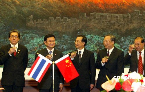 圖:溫家寶與泰國(guó)總理塔信出席中泰簽約儀式