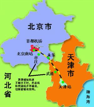 專家介紹,京津城際軌道交通工程由北京南站東端引出,沿既有京山鐵路線南側(cè)向東,過亦莊工業(yè)園區(qū)、永樂新城至天津楊村后,再沿既有京山線北側(cè)至天津站。此線建成運營后,最小行車間隔為三分鐘,北京、天津間全程直達(dá)運行時間為半個小時左右。