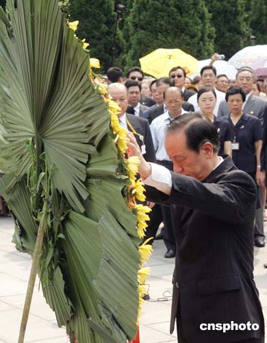 七十五歲的朱明成老先生專心地坐在墓道旁的石階上,他從報紙上看到新黨大陸訪問團要來黃花崗七十二烈士陵園祭奠,就一早從廣州的家中趕到這里等候。祖籍河南的朱老先生一九四三年在蘇北參加抗戰(zhàn),后轉(zhuǎn)戰(zhàn)東北,一九四九年南下解放廣州,從此就留在廣州生活。朱老先生至今仍稱自己是抗戰(zhàn)老兵,他記得今天是“七七事變”紀念日,贊揚新黨在抗戰(zhàn)六十周年紀念日赴大陸拜謁抗戰(zhàn)史跡,表明了新黨的愛國精神,是件非常有意義的事情。