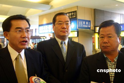 七月七日上午,國民黨“立委”李全教(左一)與國民黨中央政策會執(zhí)行長曾永權(quán)(中)、親民黨“立委”蔡勝佳(右一)在桃園機場接受采訪,介紹八日將在北京就臺灣水果登陸細節(jié)舉行的協(xié)商會議。作者:劉舒凌