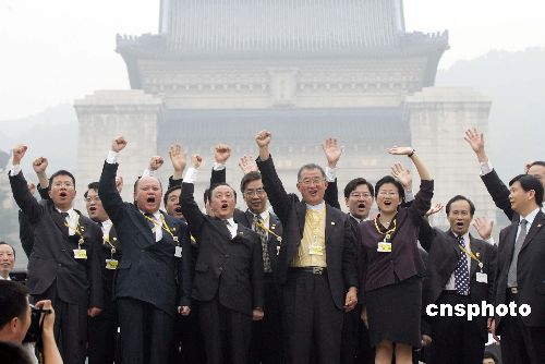 沿著三百九十二級(jí)臺(tái)階走下,郁慕明和訪問團(tuán)成員不斷向周圍的人群揮手。走到中間,訪問團(tuán)全體成員立定列隊(duì),舉起右拳,反復(fù)高聲呼喊:“和平奮斗救中國(guó)!大家加油!”贏得南京市民一片熱烈的掌聲。