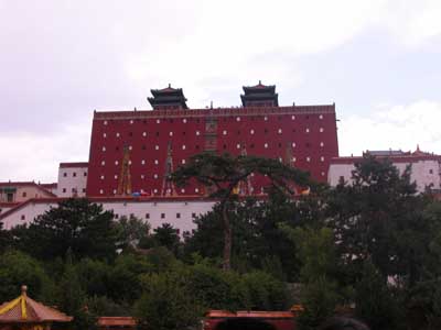 這座“小布達拉宮”始建1767年,歷經(jīng)4年竣工。它仿照了西藏布達拉宮“城”和山頂兩個部分,墻壁紅白相間,有藏式平頂?shù)锓、藏式臺塔、藏式殿堂等,但它又不僅是西藏布達拉宮的復制品,它在模仿中融合了漢族建筑傳統(tǒng),“漢藏合一式”的建筑特色在這棟占地22萬平方米的寺廟中隨處可見。