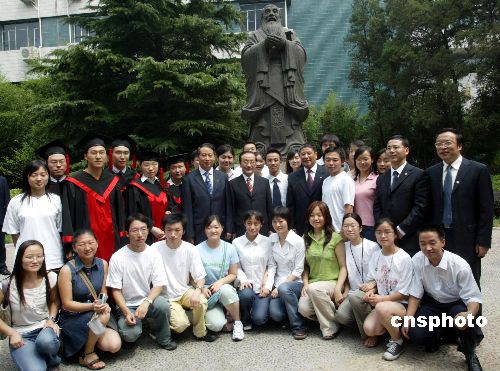 新黨主席郁慕明一行與中國人民大學學生們在孔子像前合影。作者:史利
