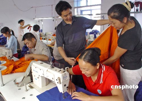 | 7月14日,湖北宜都市某制衣有限公司負責(zé)人在生產(chǎn)車間檢查產(chǎn)品質(zhì)量。今年美國和歐盟針對中國的紡織品設(shè)限和特保措施后,使這家有50多人的小企業(yè)停產(chǎn)達兩個多月,損失嚴(yán)重。6月11日,中國和歐盟達成紡織品貿(mào)易協(xié)議,也使這家小企業(yè)絕處逢生。目前,該企業(yè)又接到一批來自歐盟國家的工裝加工訂單,正組織工人夜以繼日地勞作著。作者:曹禮達