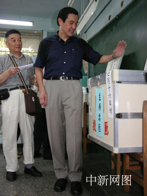 7月16日,中國(guó)國(guó)民黨主席選舉在全臺(tái)601個(gè)投票所展開(kāi)。圖為1號(hào)參選人、臺(tái)北市長(zhǎng)馬英九在居家附近的臺(tái)北興德小學(xué)參加投票,將選票投入票箱的瞬間。中新社記者 董會(huì)峰