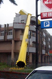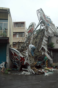 高雄縣橋頭鄉(xiāng)一座大型鐵制廣告廣告牌被強(qiáng)風(fēng)吹倒,壓到對(duì)面民宅。