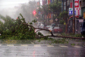 高雄地區(qū)風(fēng)雨交加,路邊樹被拔起,橫阻道路。(臺(tái)灣“中央社”圖)