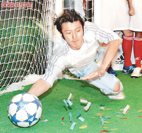 而霆鋒昨日身穿adidas推出貝克漢姆系列的球衣外,他更獲贈一件港隊球衣,不過卻沒有號碼,霆鋒笑言:“我不應該有號碼,就算真是有,就0.4號啦!”