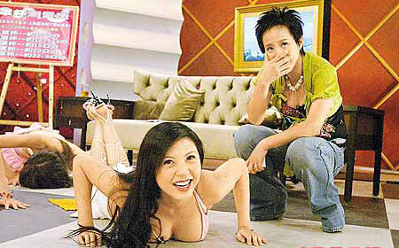 女F4隊(duì)長(zhǎng)Fanny(中)做掌上壓時(shí)受F cup上圍所累,顯得上氣不接下氣,隊(duì)友(后)更做到趴地,令主持李明依(右)笑不攏嘴。