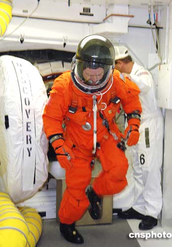 圖:美國“發(fā)現(xiàn)號”機組進入太空艙準備發(fā)射